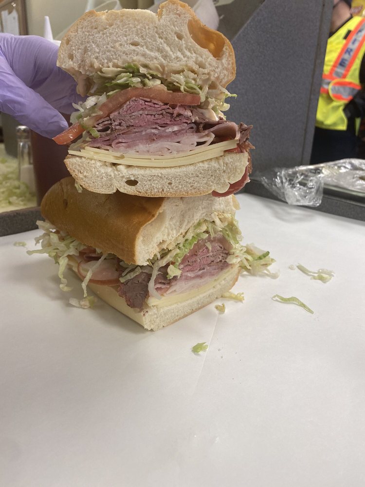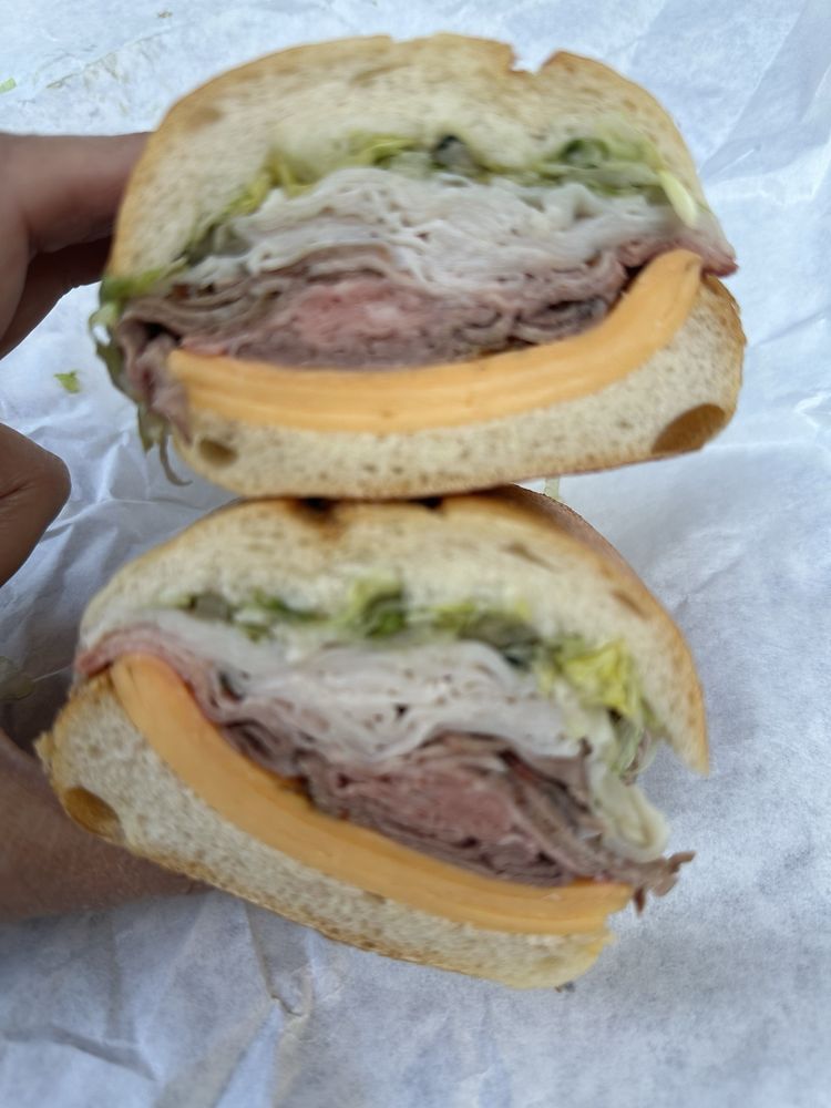 Roast beef, turkey Swiss cheese lettuce, tomato, Russian dressing.