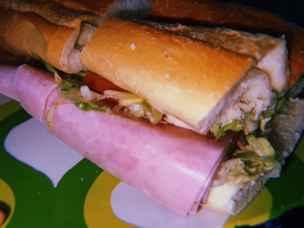 Virginia ham, corned beef Swiss cheese lettuce, tomato, Russian dressing.